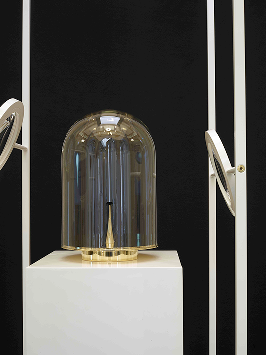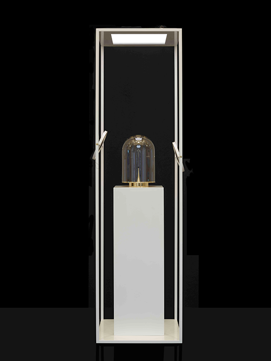 Frame: square tubes or bars 20 x 20mm; steel epoxy coating white, RAL 9010; Pedestal steel epoxy coating white, RAL 9010 Diamond display: glass dome, 250 x 350 x 5mm: Schott Duran, high transparent colorless glass; solid brass base, top gold plated: Diamond support cone, gold 18 carat; solid or 3D printed.