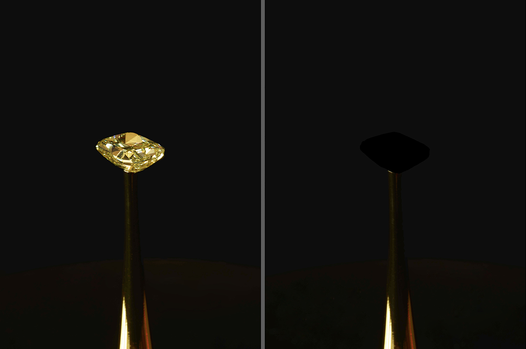 A 16.78 carat natural yellow diamond (Fancy Vivid Yellow SI1, Radiant shape, value $2,000,000) is covered with the blackest black on earth, which makes the diamond appear to disappear.