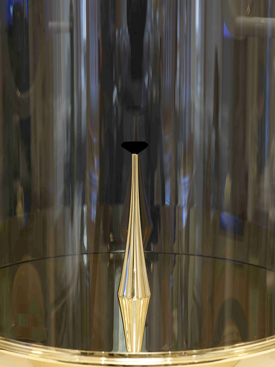 The covered diamond is presented on a small elongated golden foot encased in a safety class chamber mounted onto a pedestal. In order to be able to “see” the deprivation as efficiently as possible, the display is equipped with illuminated magnifiers. Part of the display is an armed security guard.